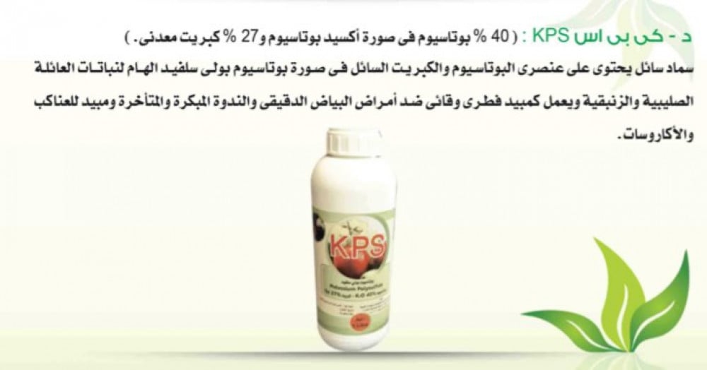 سماد سائل يحتوي على عنصر البوتاسيوم والكبريت السائل في صورة بوتاسوم بولي سلفيد الهام للنباتات العائلة الصليبية والزنبقية ويعمل كمبيد فطري وقائي ضد امراض البياض الدقيقي والندوة المبكرة والمتأخرة ومبيد للعناكب والأكاروسات